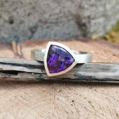angenehm abgerundet. Die Fassung ist minimalistisch gehalten um dem Stein nicht die Show zu stehlen! Der Amethyst funkelt einfach wunderschön am Finger! Für alle, die lila