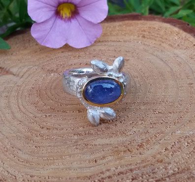 Auf der breiten Ringschiene mit Hammerschlagoptik ranken sich zwei silberne Eichenästchen um einen in Gold gefassten Tansanit-Cabochon.