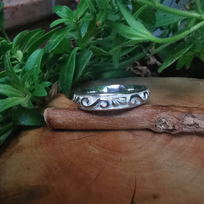 Dieser auffällige, breite Ring bildet die Samen des Wiesenbärenklaues ab, die den ganzen Ring umspannen. Echte Samen wurde hier als Vorlage benutzt und in Delfter Gießsand abgedrückt und abgegossen! Anschließend wurde der